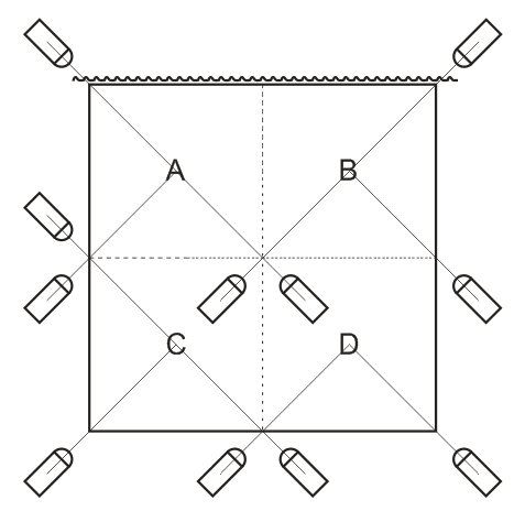 Volgende maand ga ik meewerken aan een productie waar het podium (6 x 4 meter) langs 3 kanten omringd is met publiek en langs een kant met een doek. Bijkomende moeilijkheid is dat er erg weinig plafondhoogte is (slechts 3,5 meter)