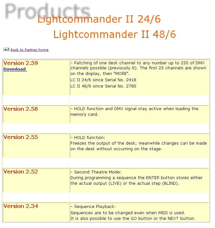 Eén van de verschillen tussen v2.51 en v2.59 zit in de softpatch. Bij 2.51 max 8 DMXadressen per fader, 2.59 is dat veel meer (24?/32?) DMXadressen per fader. Verder een kleine verandering in het maken van chases en de theatre_timing.